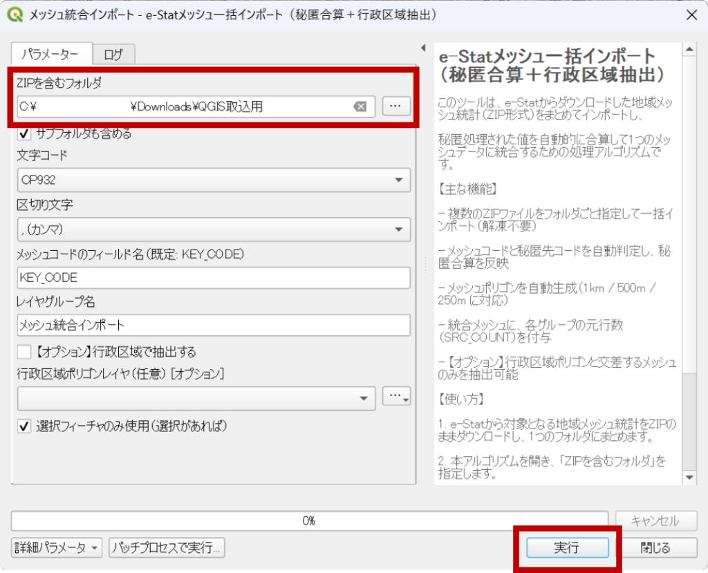指定後、「実行」をクリックします。文字コードなどのその他の項目については、基本的には初期設定のままで問題ありません。