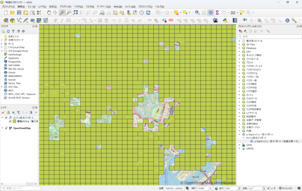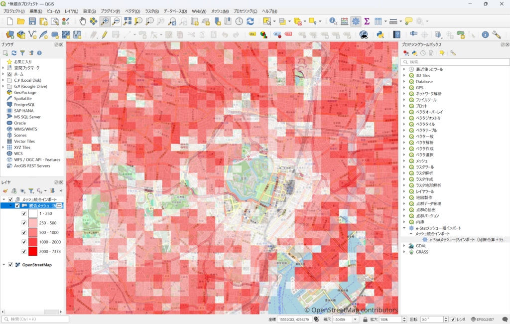 このプラグインを使うと、CSVデータを指定するだけで、メッシュ単位の地図として表示でき、境界データの取得や、属性テーブルの結合を意識する必要がありません。内部でメッシュコードに基づいた処理が行われているため、ユーザー側では最小限の操作で可視化が可能です。