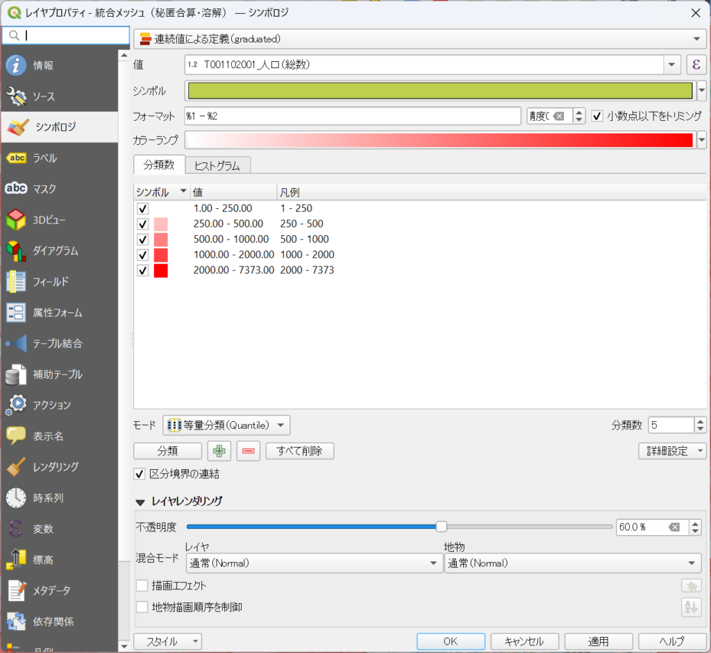 等間隔、分位数、自然分類など、用途に応じて分類方法を選択します。人口データの場合は分位数や自然分類が見やすいことが多いです。