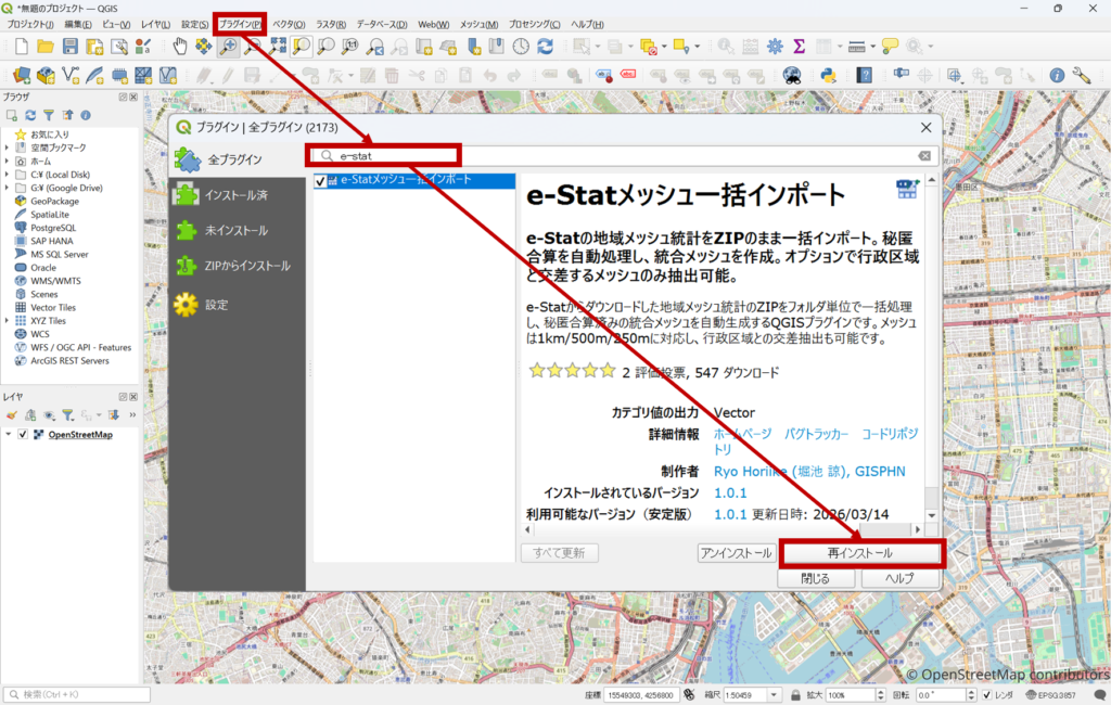 環境によっては、インストール後にプラグインが表示されない場合があります。その場合は一度QGISを終了し、再起動します。