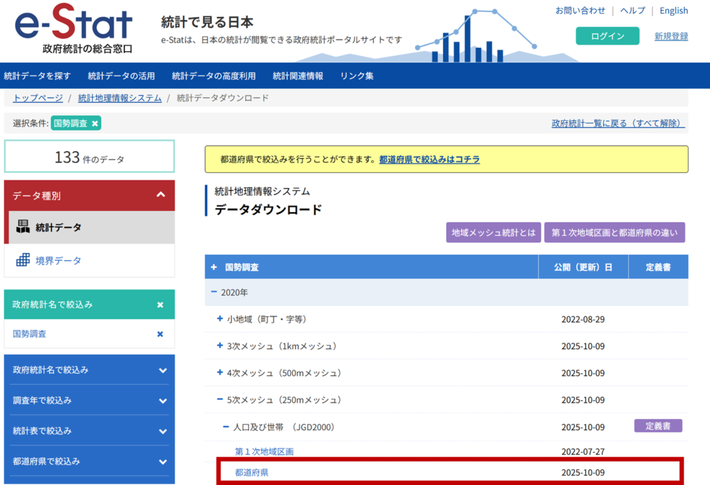 e-Stat統計データダウンロード にアクセスし、対象データを取得します。このプラグインは3次~5次メッシュデータを前提としているため、メッシュデータを選択します。