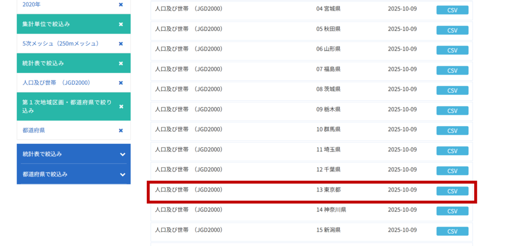e-Statのダウンロードボタン(「CSV」ボタン)を押すと、データのダウンロードが行われます。