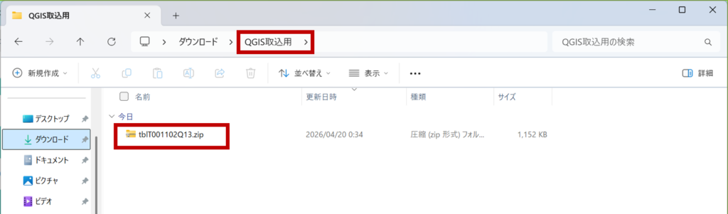 (保存先はどこでも問題ありませんが、本記事では「ダウンロード > QGIS取込用」フォルダにまとめています)