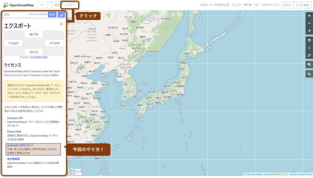 この画面にアクセスすると、左側に「エクスポート」と書かれたメニューバーが表示されます。この中から、Geofabrikのダウンロードオプションを使用します。