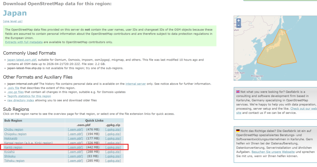 たとえば日本のデータページから、全国版や地方単位のデータを選んでダウンロードできます。広い範囲をまとめて扱いたい場合は、まずこの .osm.pbf ファイルを取得します。