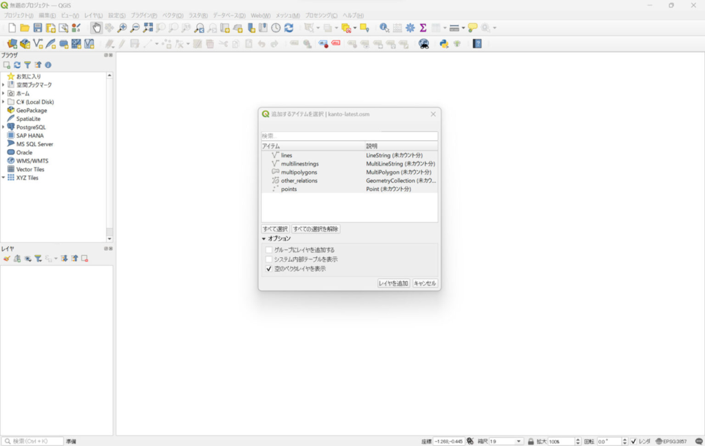ダウンロードした .osm.pbf ファイルは、QGISで読み込んで表示できます。.osm.pbf ファイルをQGIS画面へそのままドラッグ&ドロップします。