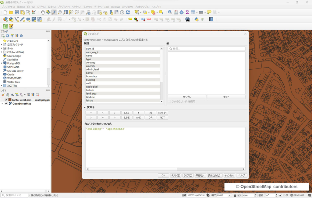 OSMの広域データは情報量が多いので、最初から全部を丁寧に描画しようとすると動作が重くなりがちです。まずは必要なレイヤだけオンにして、さらにフィルタで絞り込む流れがおすすめです。 - 欲しい地物のタグを先に確認する