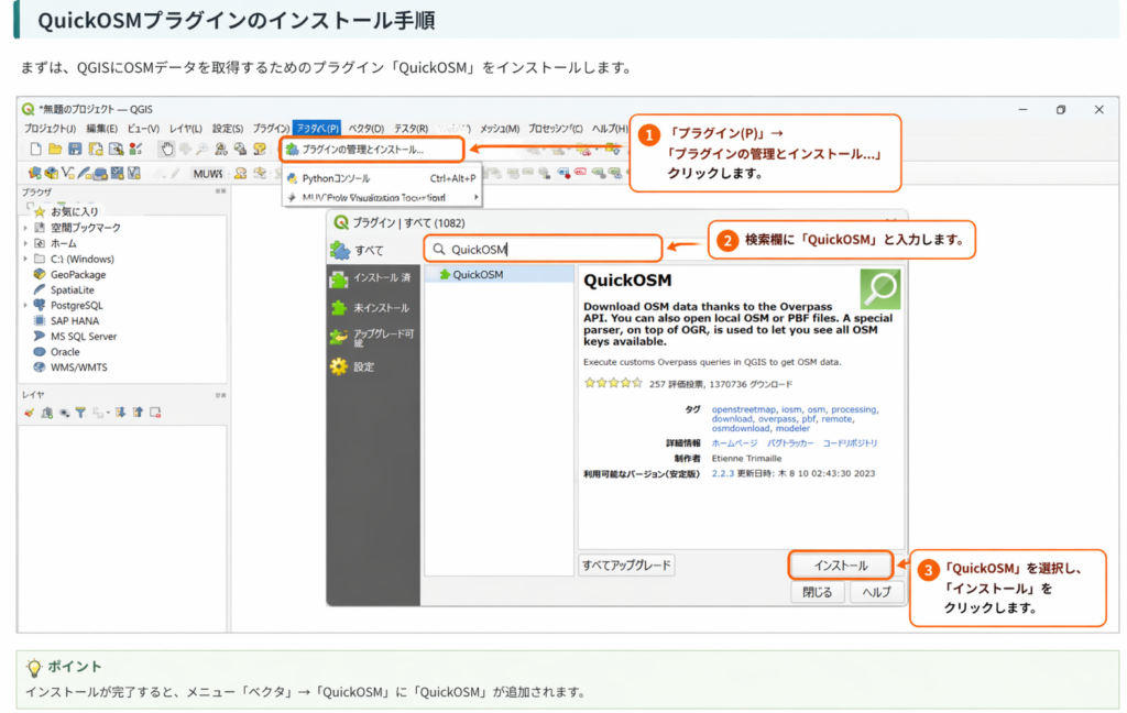 まずは、QGISにOSMデータを取得するためのプラグインを追加します。QuickOSMは、QGISから直接OSMデータを取得するためのプラグインです。