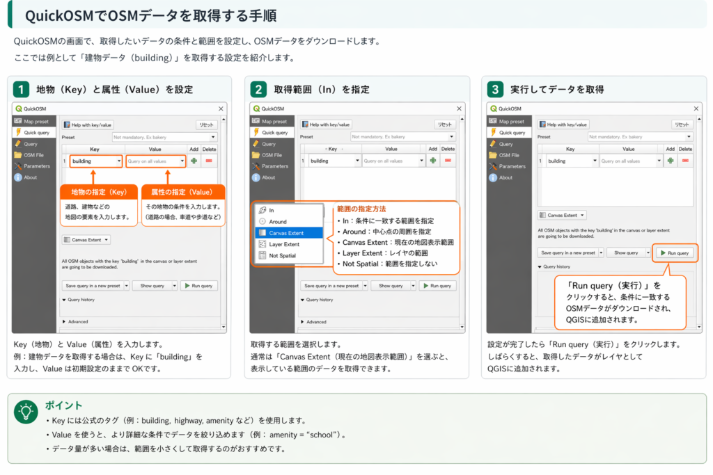 QGISで地図データを扱う際、「道路や建物のGISデータを手軽に取得したい」ときに便利なのが、OpenStreetMap(OSM)のデータです。本記事では、QGIS上でOSMデータを取得・表示する方法として、QuickOSMプラグインの使い方を解説します。