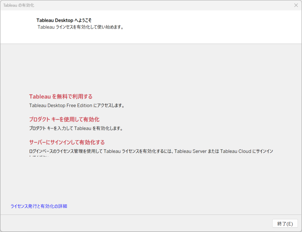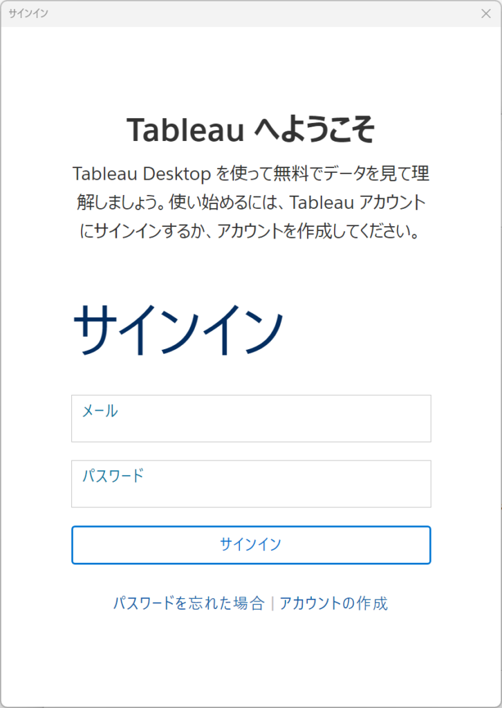 Tableauを実行します。FreeEditionは有償バージョンと途中まで同じ。Tableauのアカウント(無料で作れます)を入力することでFreeEditionとして起動します。アカウントをお持ちでない方はこのタイミングで作成してください。