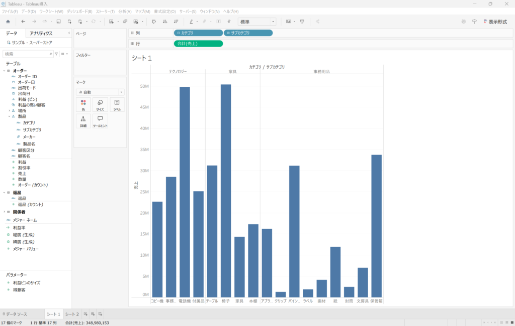 今回は、列にサブカテゴリを追加し、カテゴリの中でさらにサブカテゴリを分けて、棒グラフを表示してみましょう。すると、カテゴリ(テクノロジー・家具・事務用品)のグループは表示され続けたうえで、グループの中にサブカテゴリをもとに棒グラフが表示されました。ディメンションを横方向に追加すると、このようにグループの粒度が細かくなります。
