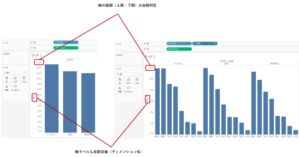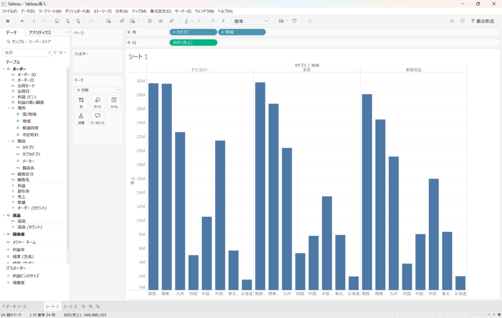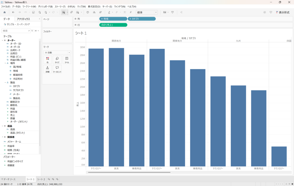 今度は列に入れているディメンションの順番を入れて変えてみましょう。現在カテゴリ→地域と並んでいるディメンションを地域→カテゴリに入れ替えてみましょう。すると関西地方で大グループを作ったうえで、その中でカテゴリ別のグラフが表示されるようになったかと思います。列(または行)に入れる順番で左から順に大項目として扱われるのがTableauの特徴です。