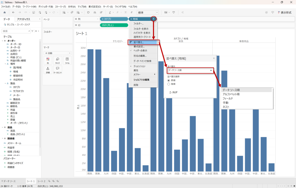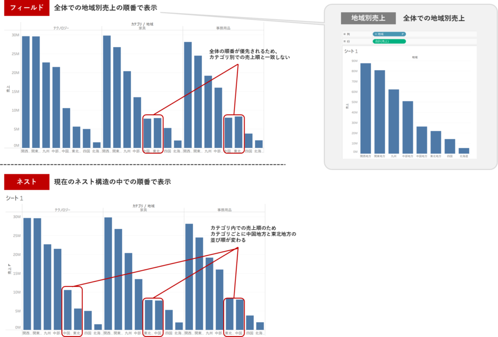 そのため、先ほど記載した「テクノロジーの中で売上が大きい地域を一番左に、売上が2番目に大きいカテゴリをその隣に…」の並べ方をしたい場合は「ネスト – 降順 – 売上 – 合計」を選択する形となります。