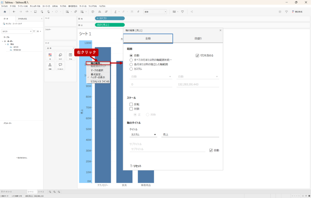 最後に、グラフの見え方に関わるポイントとして「軸の設定」も軽く触れたいと思います。Tableauではデフォルトで、データに応じて軸の範囲が自動で調整されます。そのため、グラフごとにスケールが変わることがあります。